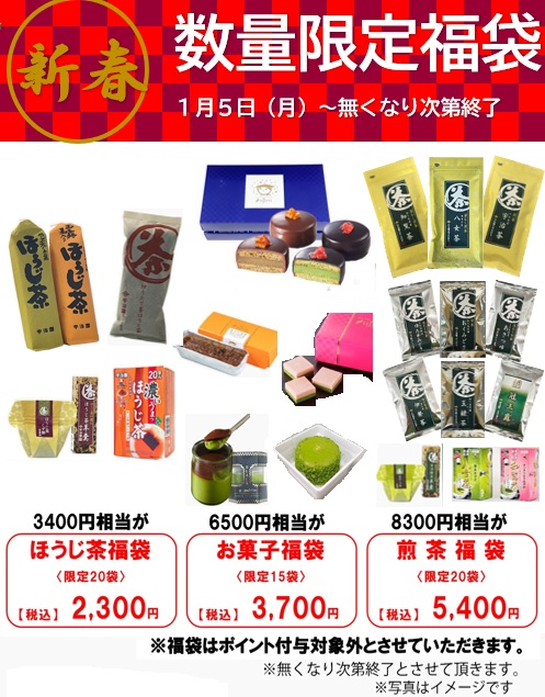5日より、毎年恒例の福袋3品(煎茶、ほうじ茶、冷凍スイーツ)“超お買得プライス”にて各種限定数を用意しております。