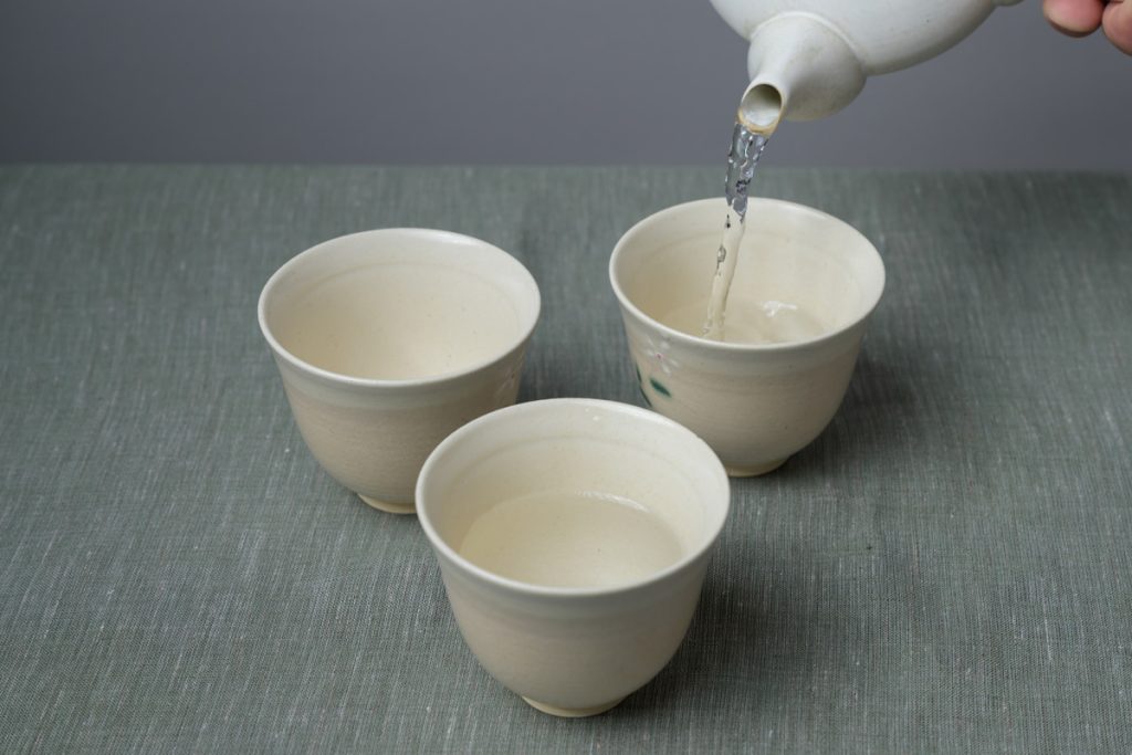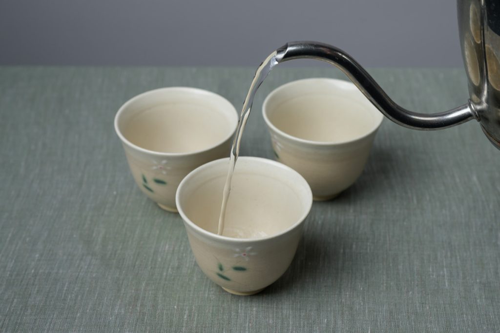 さらなる湯冷ましのため急須のお湯を湯のみに注ぎます。