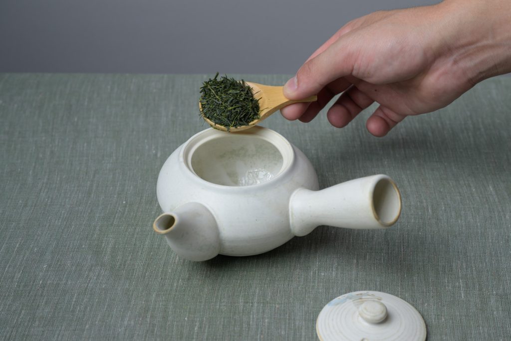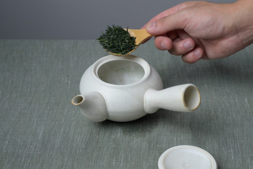 次に煎茶、深蒸し茶の茶葉を急須に入れます。茶葉の量は3人分で約6g(大さじで軽く1杯と半分くらい)です。人数が少ない時は一人分の茶葉の量を少し多めにしましょう。
