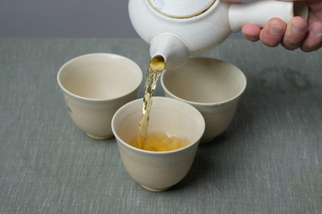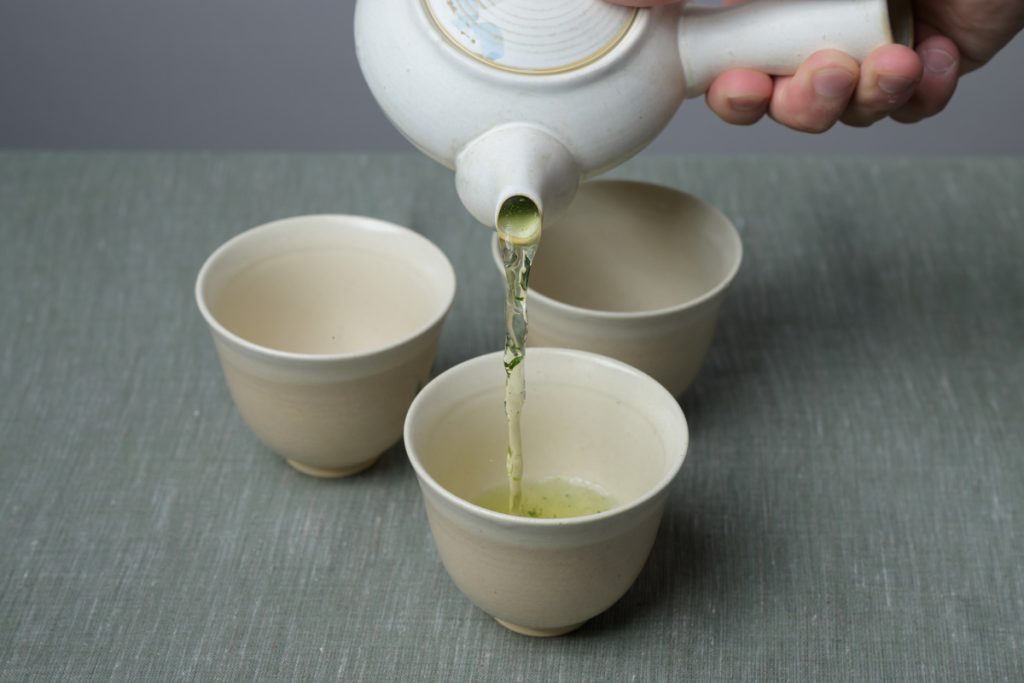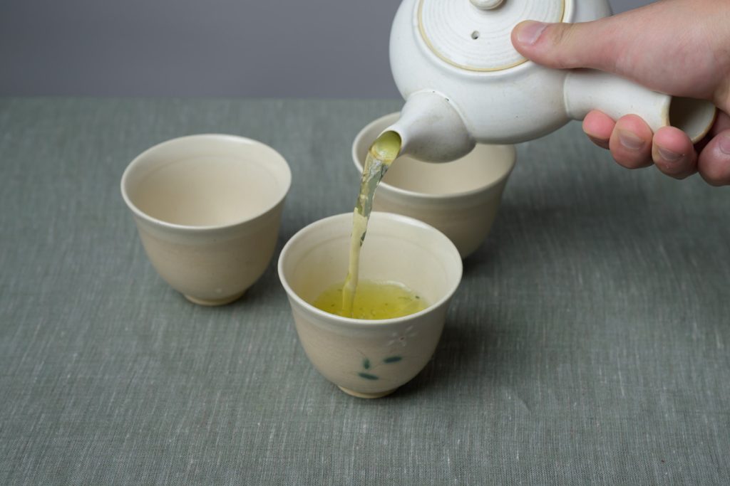 味や濃さが均一になるように湯のみに均等に廻しつぎして最後の一滴まで出しきります(最後の一滴においしさが凝縮しています。お茶の味は最後の一滴で決まるとも言われています。)
