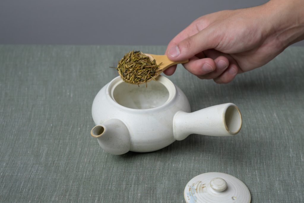 お茶の葉を急須または土瓶に入れます。茶葉の量は5人分で約15g(大さじで多めに2杯分)です。